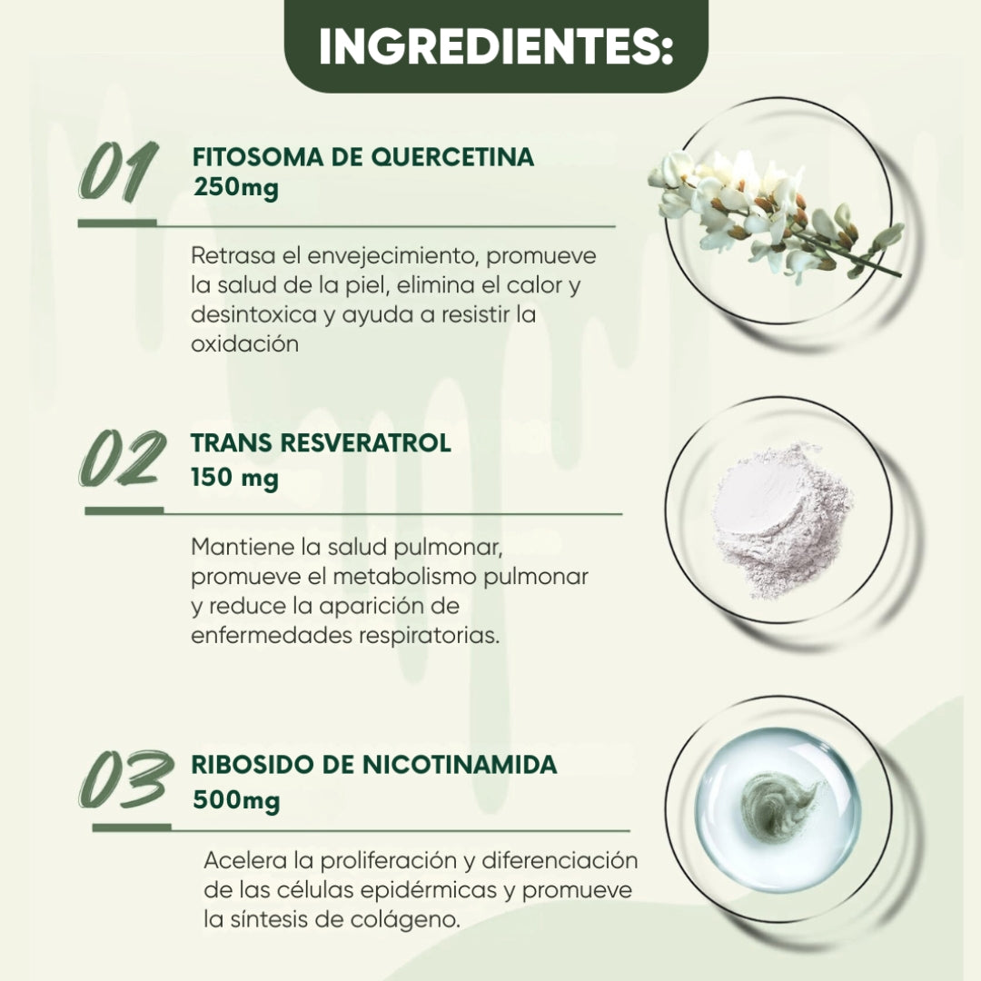 Sus ingredientes trabajan juntos para mejorar tu energía, cuidar tu piel y hacerte sentir mas Joven.